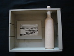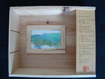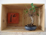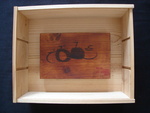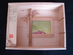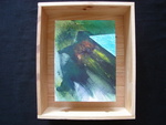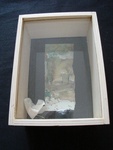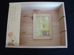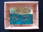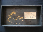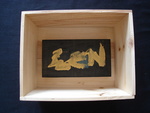 2005Collage van zwartgelakte wijnkist met gouden spatten en sumiye tekening van een kikker met eigengemaakt gedicht.
